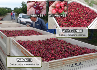In the trial to the left, the cherries treated with NEB showed advanced maturity, better color, enhanced grade and higher yield.